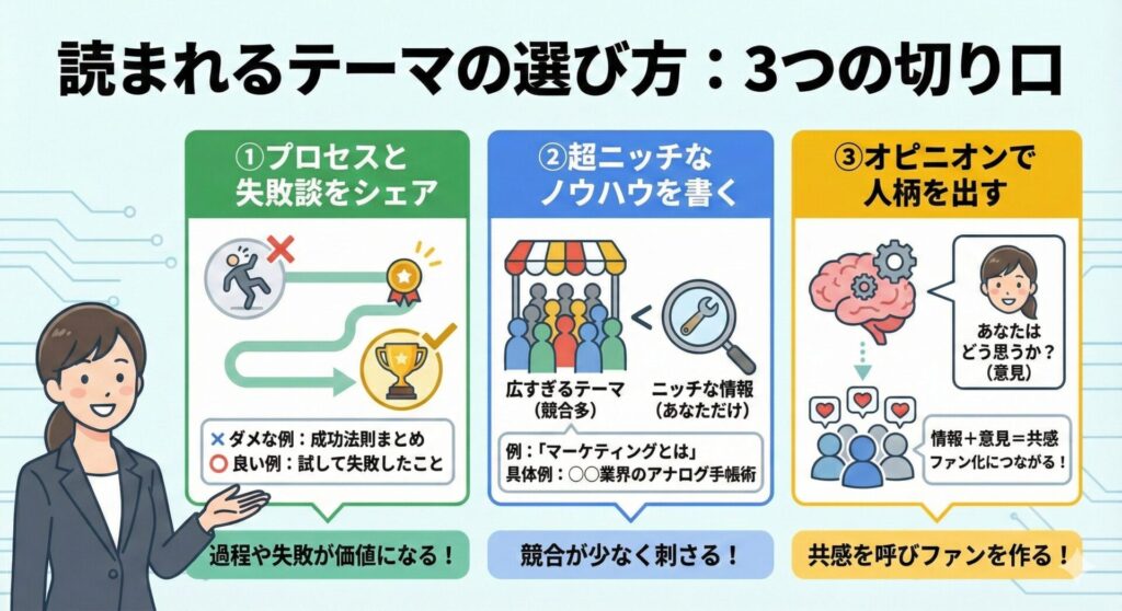 広すぎるテーマ(例:「マーケティングとは」)は競合が多すぎます。あなたしか知らない、あるいは特定の状況下でしか使えないようなニッチな情報を発信しましょう。