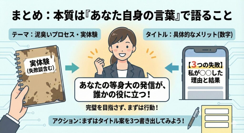 行動: まずは「自分にしか書けない失敗談」を一つ、記事にしてみましょう
