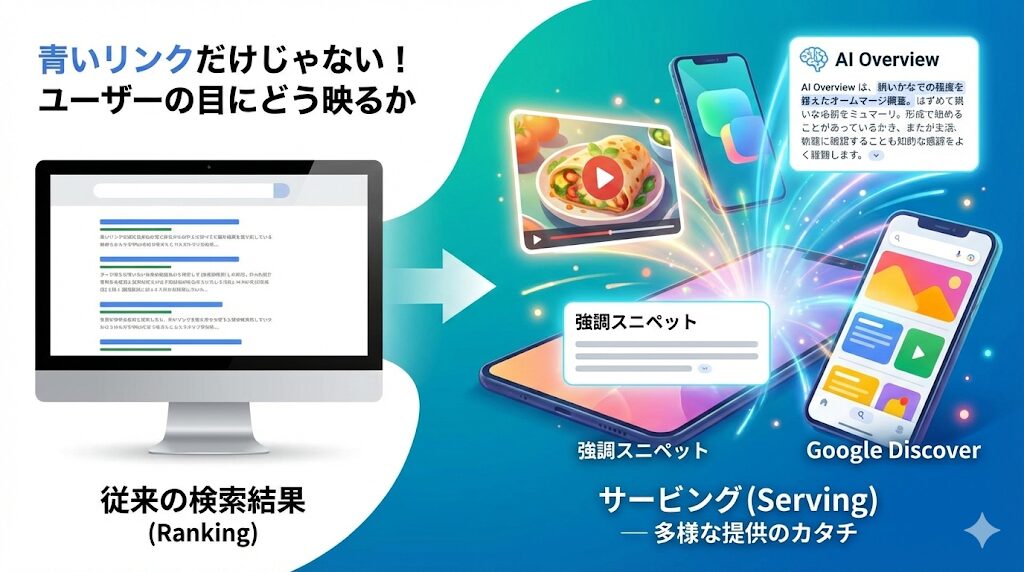 しかし現在、Google検索や各種アプリでは、順位以上に「コンテンツがどう提供されるか(サービング)」が重要視され始めています。