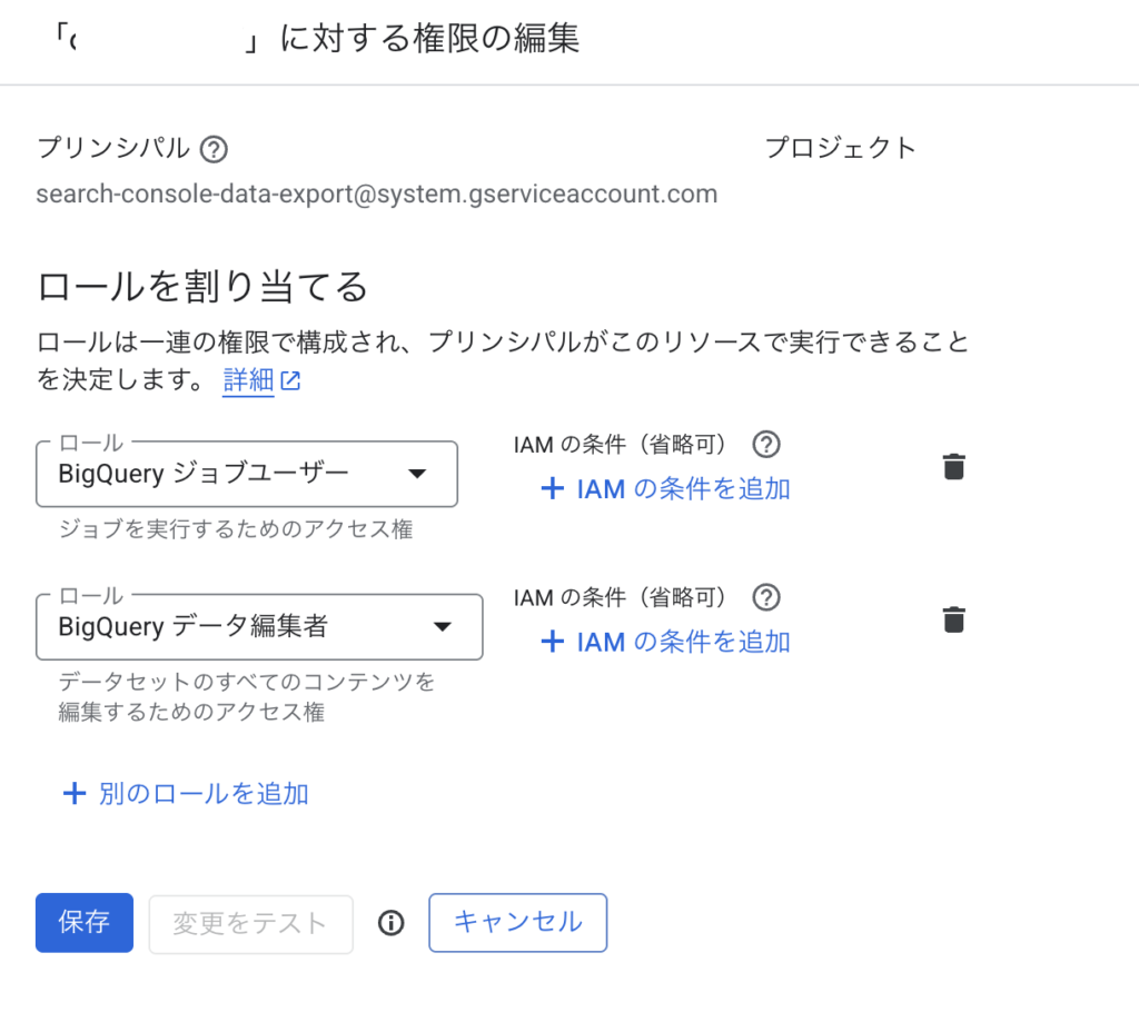 ここが多くの人がつまずくポイントです。Googleのデータエクスポート用アカウントに対して、あなたのプロジェクトへのアクセス権を与えます。