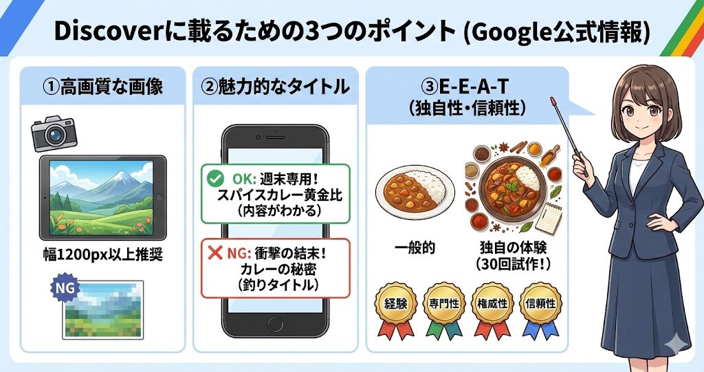 例えば、「美味しいカレーの作り方」という一般的な記事よりも、「スパイスから30回試作して辿り着いた、週末専用カレーの黄金比」といった、あなた独自の体験や熱量が伝わる記事の方が、Googleは「おすすめ」としてユーザーに届けたがります。
