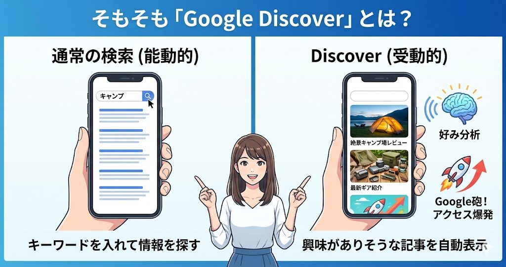 例えば、あなたが最近「キャンプ」についてよく検索しているなら、キャンプ場のレビュー記事や最新ギアの紹介記事が、検索していなくても自動的に表示されますよね。あれがDiscoverです。