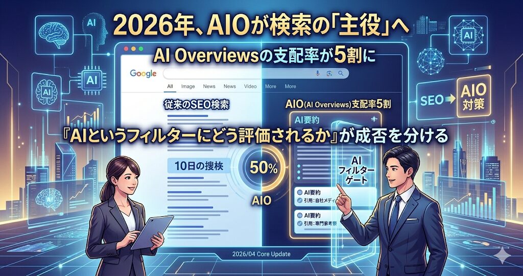検索結果の半分以上に、AIが生成した回答が表示されるようになりました。これはSEO(検索エンジン最適化)が、AIエージェントに評価されるための「AIO(AI Overviews対策)」へと完全に統合されたことを意味します。