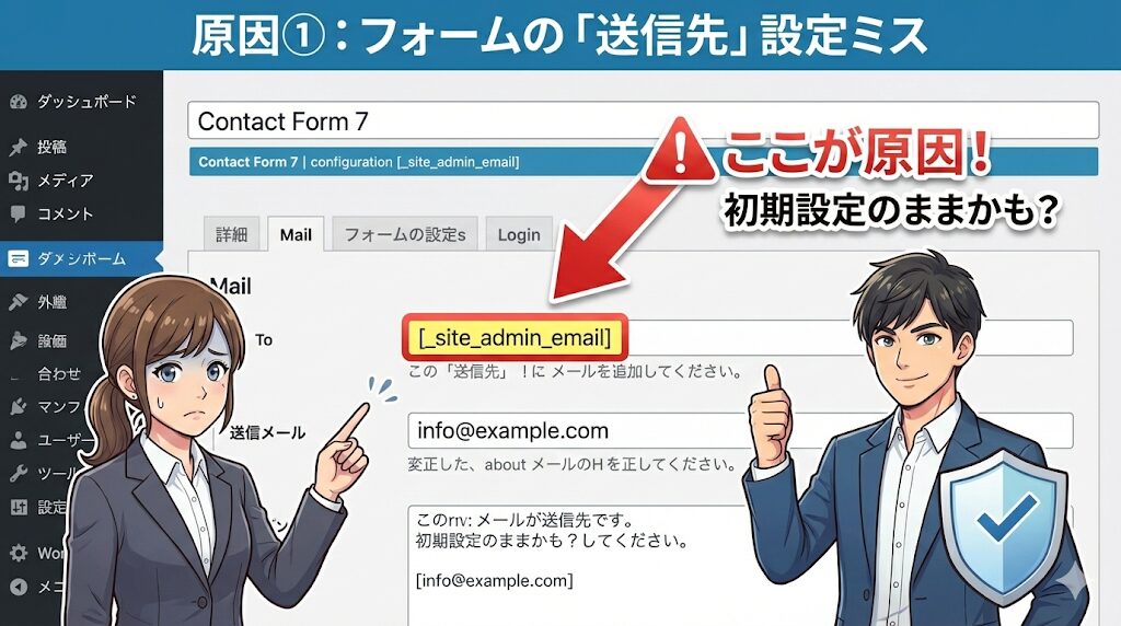 原因①:フォームの「デフォルト設定」が管理者アドレスになっている
