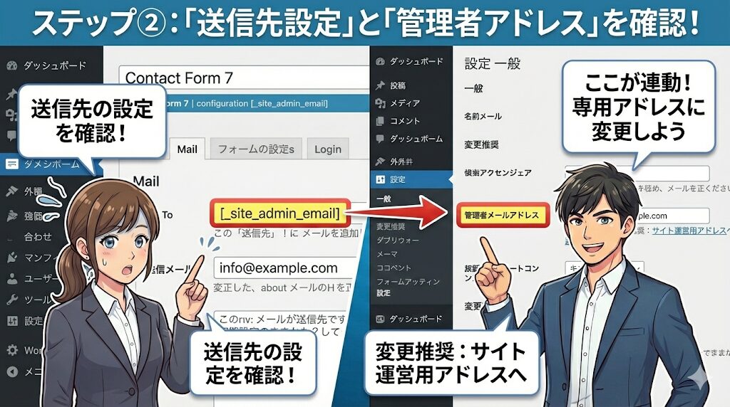 [_site_admin_email]というコードが入っている場合、WordPressの「設定」>「一般」にある「管理者メールアドレス」に送信されます。 - 管理者アドレスの変更:もし個人のアドレスに届いて困る場合は、WordPressの管理者メールアドレスを、サイト運営用の専用アドレスに変更しましょう。
