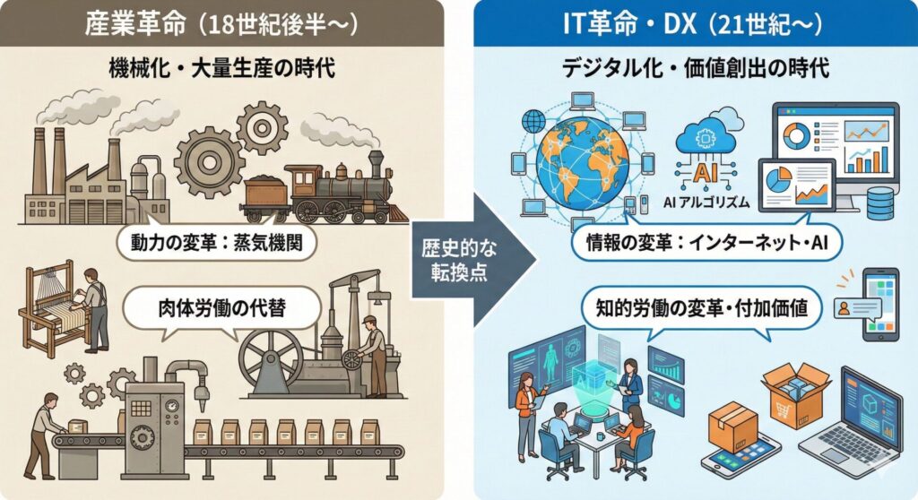 - 昔: 手作業でモノを作っていた → 機械を導入して工場を作った(産業革命)