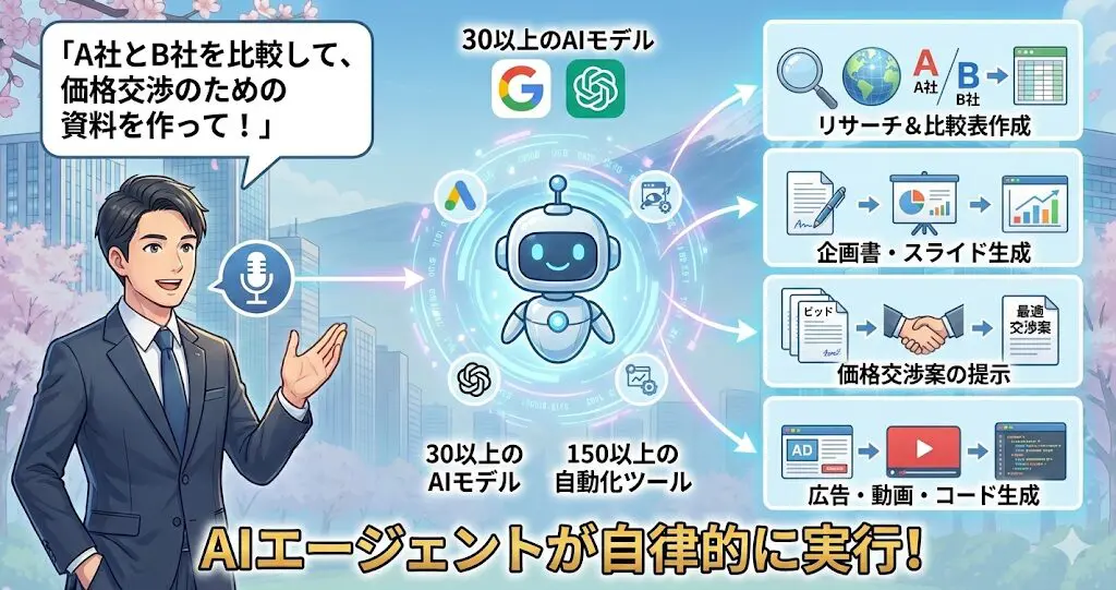 例えば、「A社とB社の製品を比較して、価格交渉のための資料を作って」と頼めば、リサーチから資料作成までをAIエージェントが自律的に行ってくれるのです。