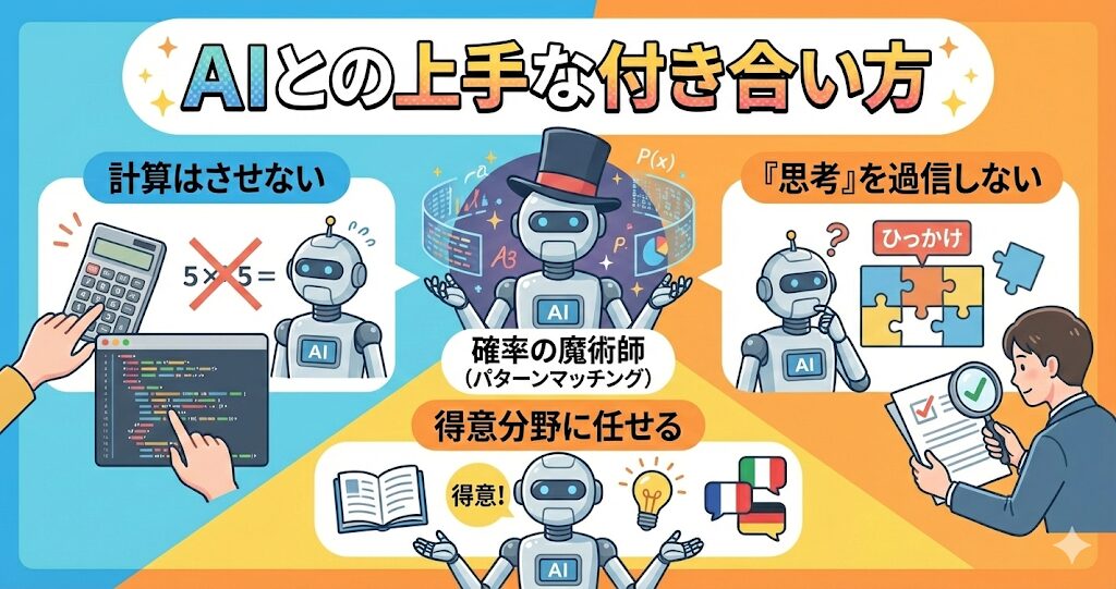 AIは万能な「電子頭脳」ではなく、言葉を操るのが上手な「確率の魔術師」です。その特性を知っていれば、計算ミスにイライラすることなく、賢く使いこなすことができるはずです。
